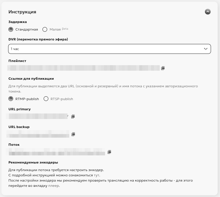 В случае способа предоставления потока "Publish" для начала трансляции потребуется специальное программное обеспечение - энкодер, поддерживающий протоколы RTMP, RTSP или SRT. Мы рекомендуем заранее выбрать и настроить подходящий энкодер. Подробные инструкции по настройке популярных энкодеров доступны в соответствующем разделе документации.