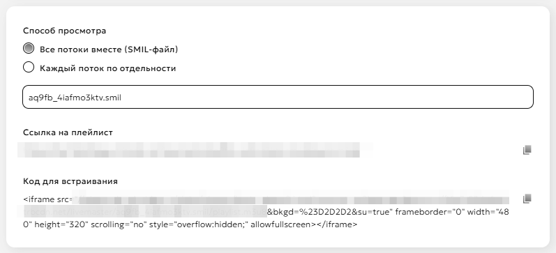 После нажатия на кнопку "Настроить" под плеером вы будете перенаправлены на страницу настроек плеера, где вы можете выбрать удобный способ просмотра: просмотр созданных потоков по отдельности или всех потоков вместе в одном плеере. Под формой выбора способа просмотров можно найти ссылку на плейлист и код для встраивания плеера на вашу web-страницу.