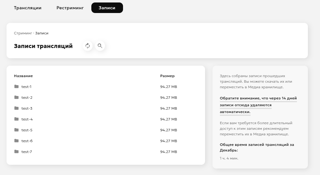 На странице "Записи" отображается список трансляций, для которых есть записи и памятка с важной информацией.