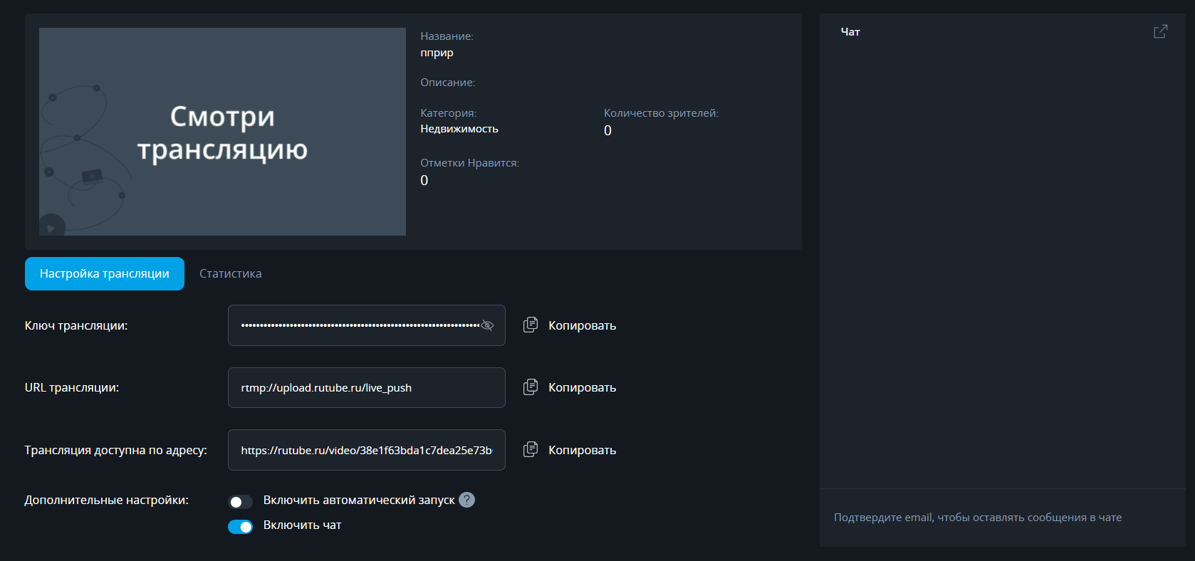 Для этого необходимо получить от медиаплатформы URL и ключ трансляции, на которые можно опубликовать поток.