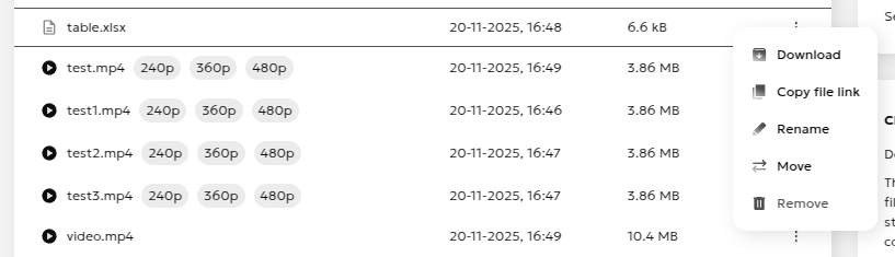 Clicking on a file in the list either initiates a download or (for mp4) redirects to the viewing page.